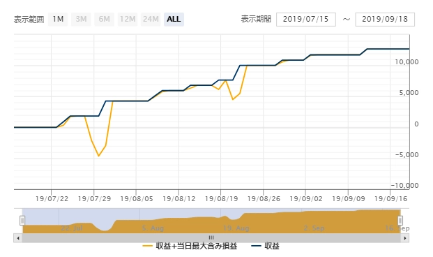 ただし、Lotは初期設定の0.1の場合、初回ポジション(0.1Lot)、第2ポジション(0.18Lot)、第3ポジション(0.32Lot)、第4ポジション(0.58Lot)、第5ポジション(1.05Lot)と増えていくため、資金管理には注意する必要がありそうです。