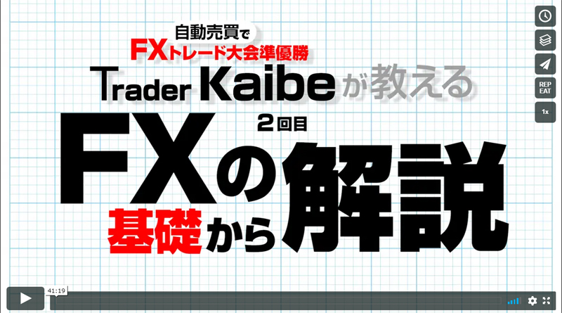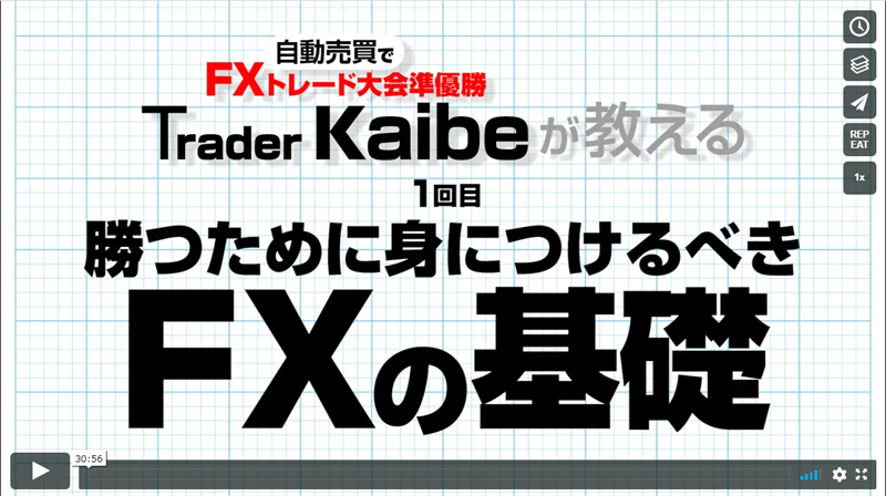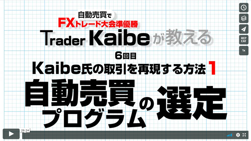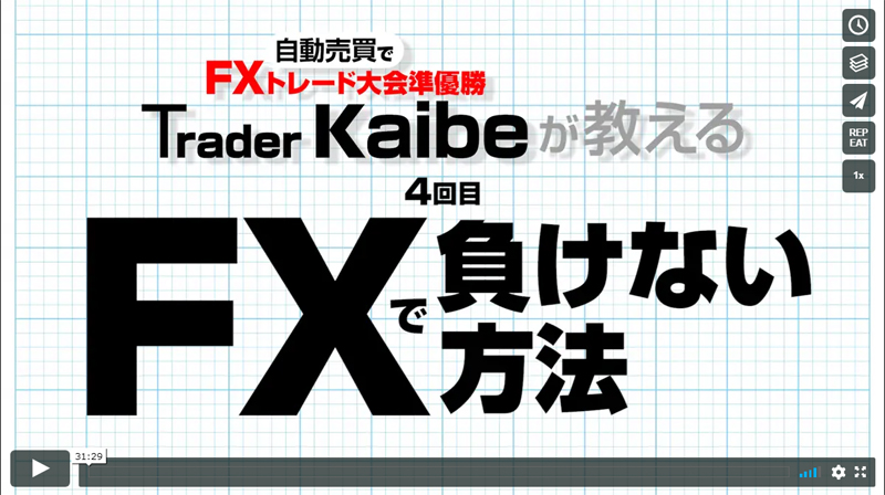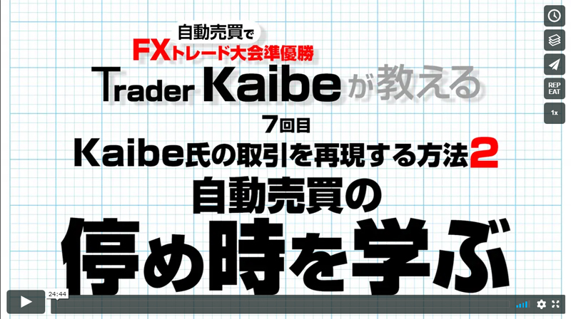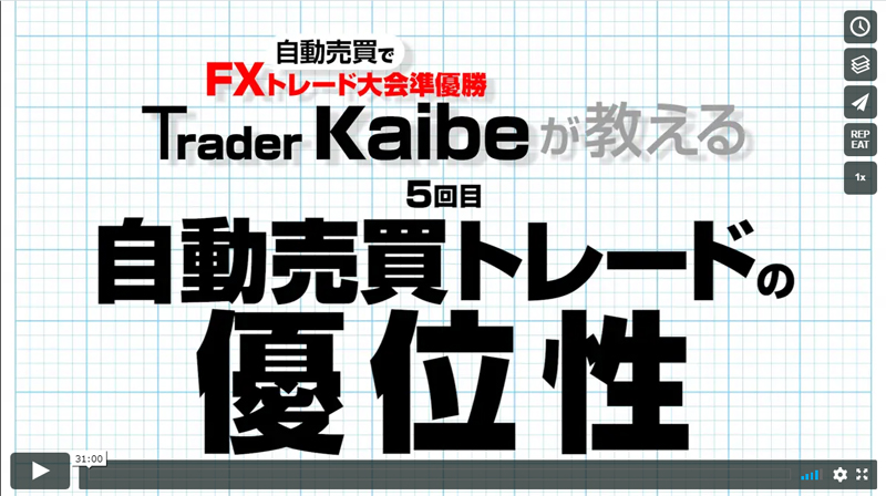 この動画では、FXトレード大会を自動売買取引で準優勝したKaibe氏と同様の取引結果を狙うトレード方法を知ることができます。