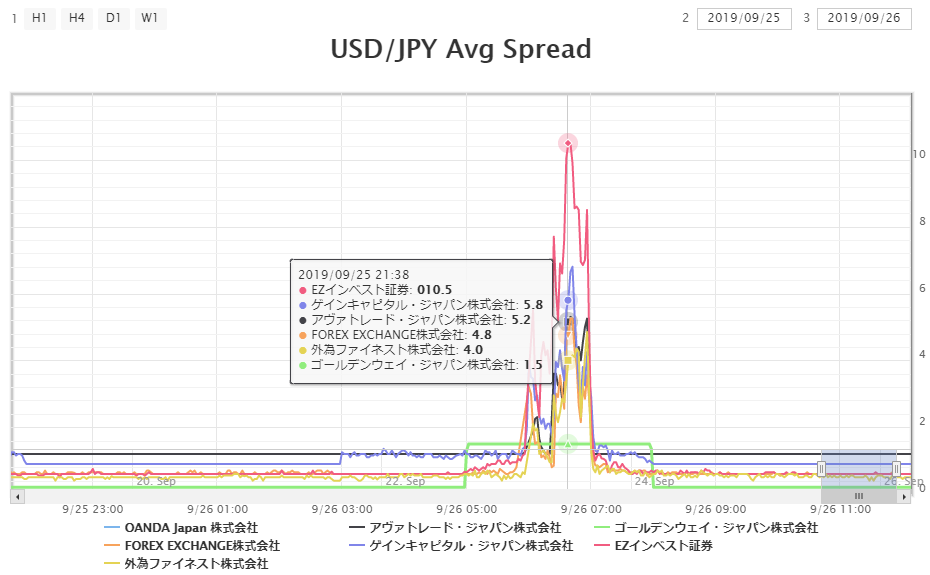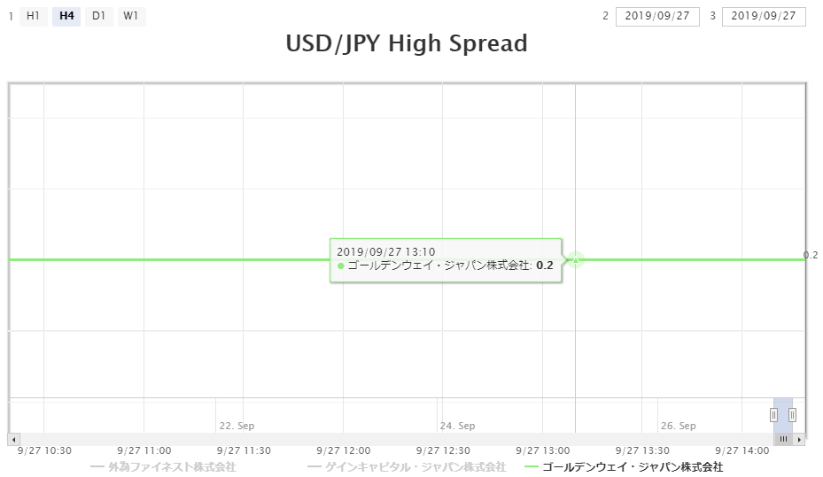 原則固定ということで、期間限定のキャンペーンではない価格設定の本プラン。相場の流動性や急激な為替変動によってはスプレッドが広がる場合もありますが、そのようなタイミングであっても他社比較でゴールデンウェイ・ジャパン社のスプレッドが大きく広がっていないことも確認できます。
