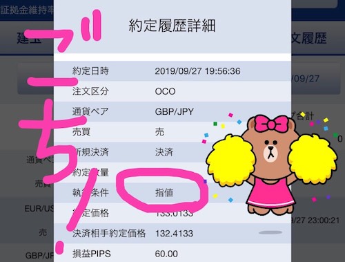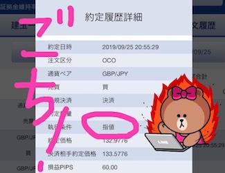 - 利益確定が60pips、損切りが−50pipsのOCO決済