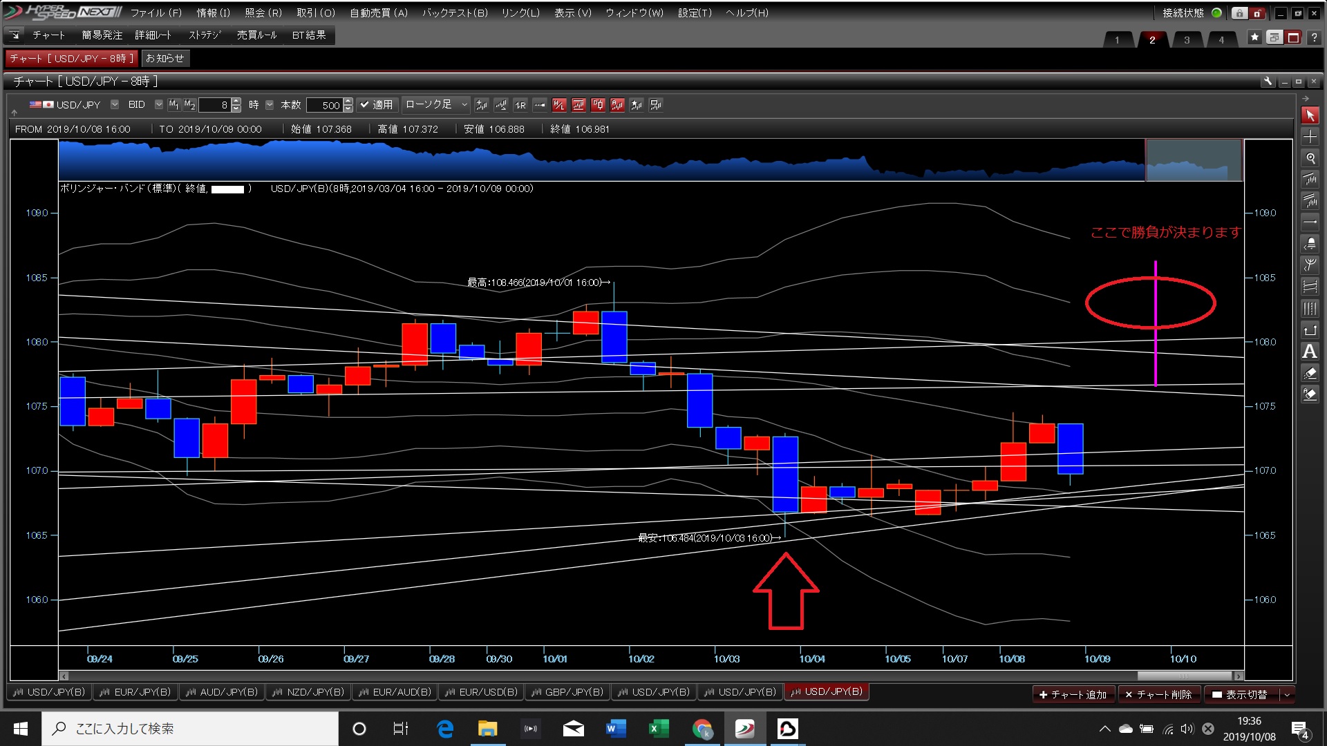 この足が陽線なら上げの可能性あり、逆なら下げの可能性ありという 勝負=投資タイミングも分かる方法を用いて画像のようになりました