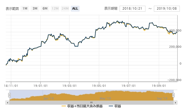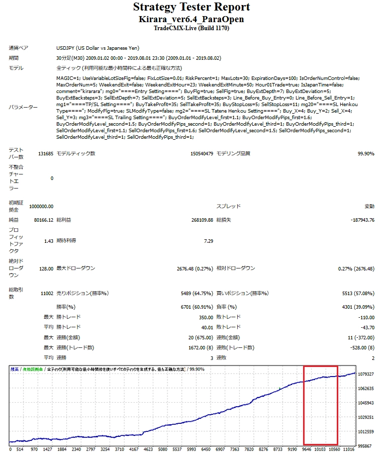過去10年間のバックテストでは、取引回数が非常に多いにもかかわらず良い結果を残しており、資産が増え続けていることが分かります。もちろん、バックテストのみならずリアル運用でも高いパフォーマンス性を発揮しているので、安心して使うことができます。