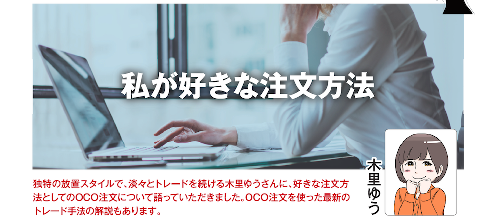 独特の放置スタイルで、淡々とトレードを続ける木里ゆうさんに、好きな注文方法としてのOCO注文について語っていただきました。OCO注文を使った最新のトレード手法の解説もあります。