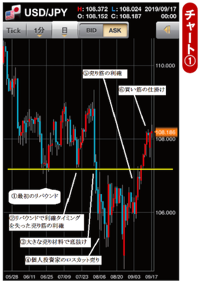 眞壁 この企画は参加者に課題を出し、「トレードを熟達させるためのプロセス」をたどる形式となります。前回は「相場では需給があらゆる材料に優先される」という話をしました。為替や株価は経済状況そのものよりも中央銀行の政策で大きく変動します。ここには「価格が動くほどの資金筋」と「値動きに翻弄される個人投資家」の存在があります。資金筋には「リスクの低いところにマネーを入れる(利確も損切りもしない)」と「個人投資家のロスカットを狙って価格を動かす」というタイプがあります。一方で、個人投資家には「上がれば売り、下がれば買う」「含み益は早く確定し、含み損は大きくなっても耐えようとする」「含み損が許容額を超えると強制決済される」という傾向があります。こうした値動きの裏にある原理を理解できるようになれば利益を得られるチャンスも増えます。例えば、最近のドル円のチャートを見るだけでもこのように考えられます(チャート①)。