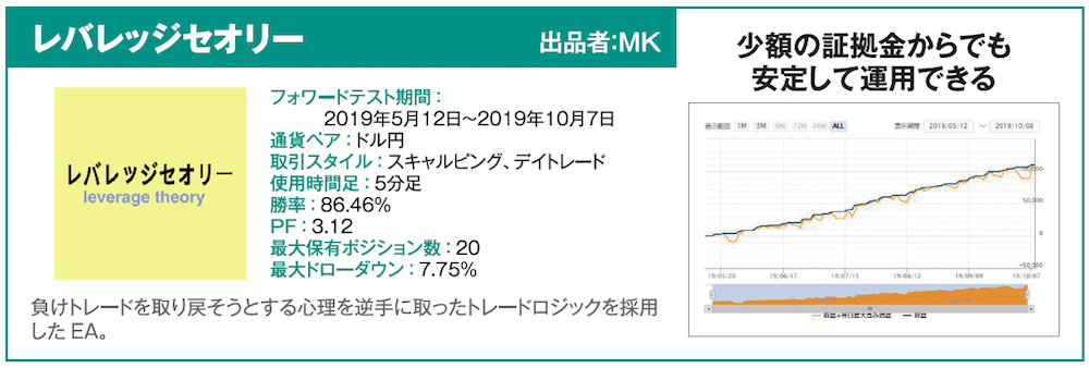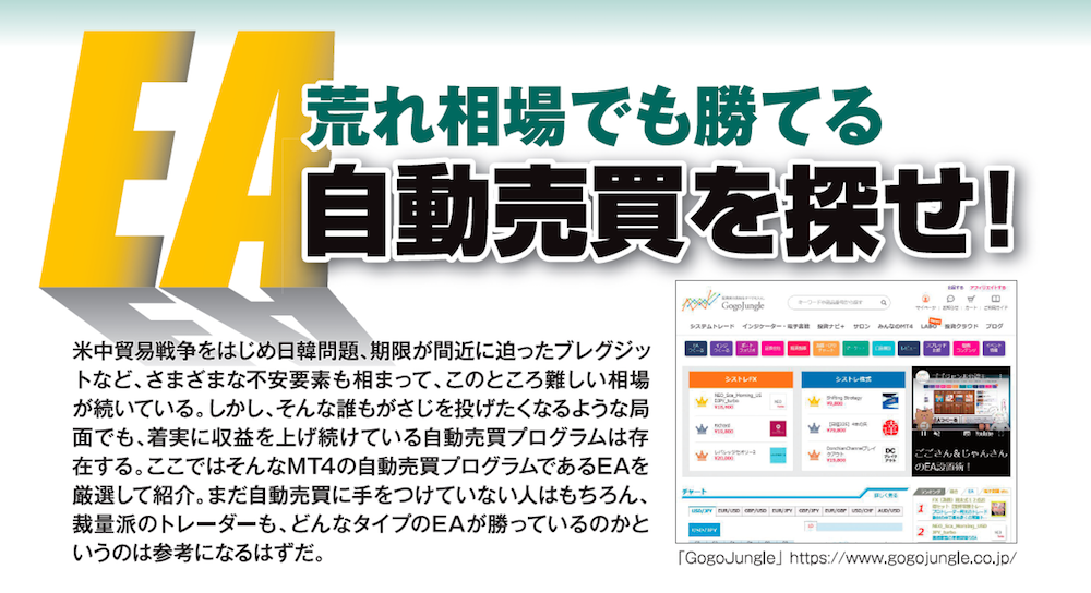 米中貿易戦争をはじめ日韓問題、期限が間近に迫ったブレグジットなど、さまざまな不安要素も相まって、このところ難しい相場が続いている。しかし、そんな誰もがさじを投げたくなるような局面でも、着実に収益を上げ続けている自動売買プログラムは存在する。ここではそんなMT4の自動売買プログラムであるEAを厳選して紹介。まだ自動売買に手をつけていない人はもちろん、裁量派のトレーダーも、どんなタイプのEAが勝っているのかというのは参考になるはずだ。