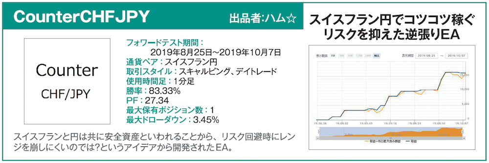 スイスフランと円は共に安全資産といわれることから、リスク回避時にレンジを崩しにくいのでは?というアイデアから開発されたEA。