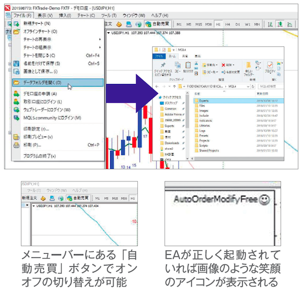 MT4を起動したらツールバーの「ファイル」から「データフォルダを開く」をクリック。「MQL4」フォルダ中の「Experts」フォルダ内に拡張子がex4ファイルまたはmq4ファイルのEAプログラムを入れる。MT4を再起動した後、ナビゲーターウインドウの「エキスパートアドバイザ」から任意のEAをチャートにドラッグ&ドロップ。チャートの右上に、EAの名前と笑顔のアイコンが表示されれば設置完了だ。EAのオンオフは、上部アイコンの「自動売買オンオフ」ボタンで切り替えることができる。