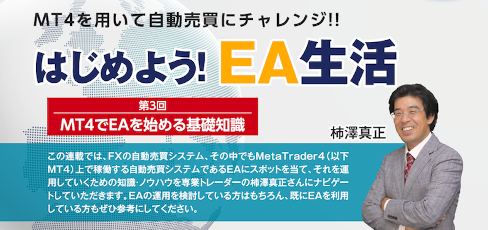 この連載では、FXの自動売買システム、その中でもMetaTrader4(以下MT4)上で稼働する自動売買システムであるEAにスポットを当て、それを運用していくための知識・ノウハウを専業トレーダーの柿澤真正さんにナビゲートしていただきます。EAの運用を検討している方はもちろん、既にEAを利用している方もぜひ参考にしてください。