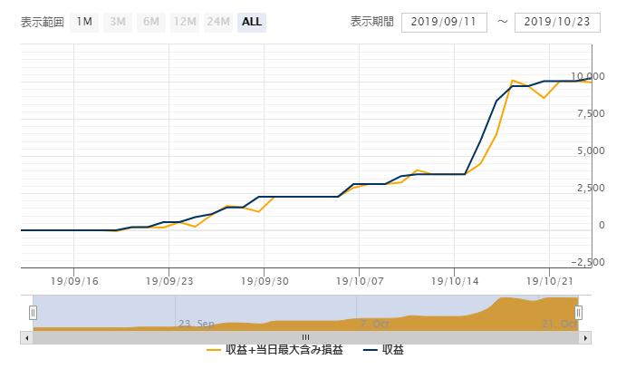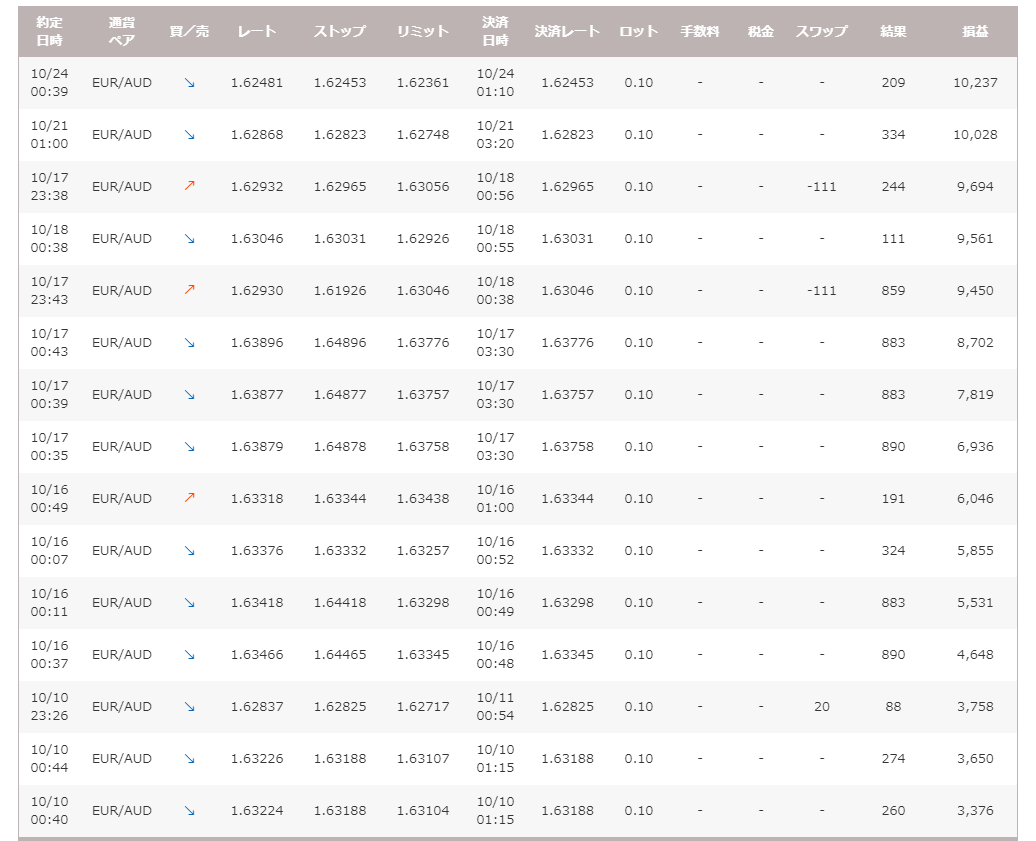 この「Storm_EA」は、ユーロ豪ドルを対象とした超高頻度取引型のEAで、サーバー時間の23:15~1:00(日本時間の早朝)あたりを狙ってエントリーを仕掛けます。2019年10月24日時点の勝率は100%(25戦25勝)と、高パフォーマンスを発揮しており、着実に利益を積み重ねています。