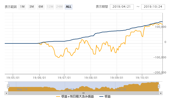 初期TP=120円、ポジション数12、ナンピン幅4.3pips、初期ロット0.02、ロットup0.01