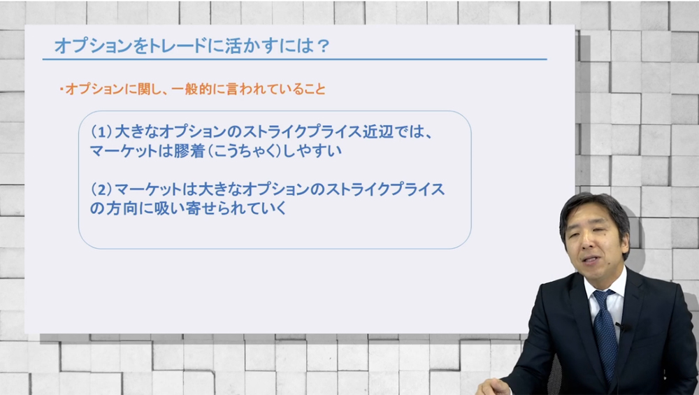 その一部をご紹介すると、大きなオプションが入っているストライクプライス(オプションの売り買いの価格)近辺では値動きが膠着し易くなるというものです。