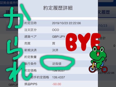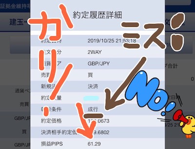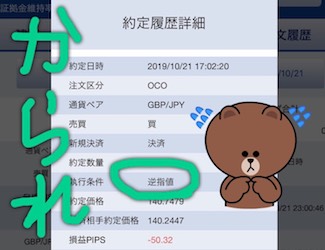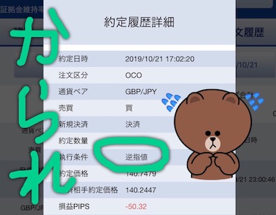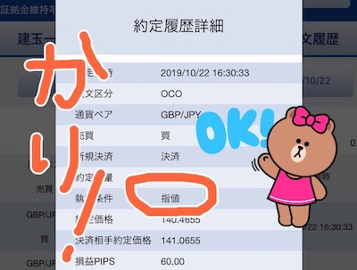 10月25日に凡ミスをしてしまいました。OCOの利益確定を+60pipsにするはずが、+80pipsにしてしまっていました。ふとポジションを見たときに含み益が60pips以上になっていたので、あれ?と思って確認することで発覚。成行決済で事なきを得ました。イージーミス続いているから気をつけます。