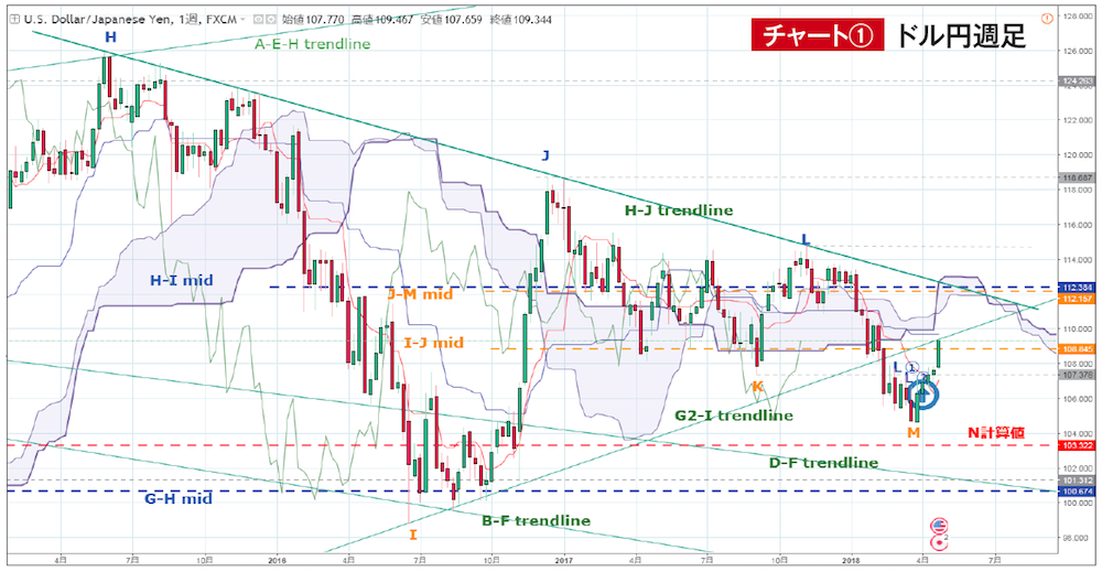 前月号の段階で、ドル円週足チャートの最新足は直近の陰線を切り返す動きを見せており、コメントの中でも「もみ合い放れ」にそぐわない動きとして警戒はしていましたが、今月の週足(チャート①)を見てもお分かりの通り、切り返した週から5週連続で陽線を作り、安値③の直近安値Kをも越えて、I-Jmidの水準もわずかながら回復している状況です。