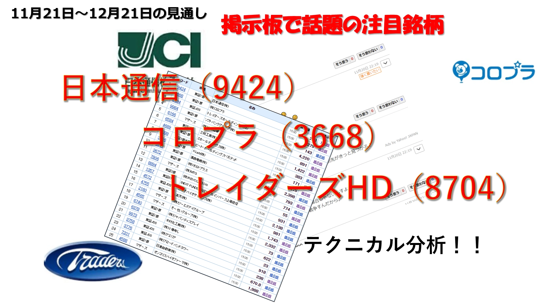【注目銘柄】11月21日~掲示板で話題の銘柄トップ3を株初心者にも分かりやすくテクニカル分析で解説してみた