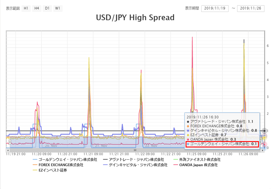 ▲2019年11月26日16:30時点のドル円のスプレッドグラフです。2019年11月19日から1週間の計測結果ですが、0.1銭原則固定(例外あり)が継続されています。他社と比較するとゴールデンウェイ・ジャパン社が最狭水準を維持していることが確認できました。