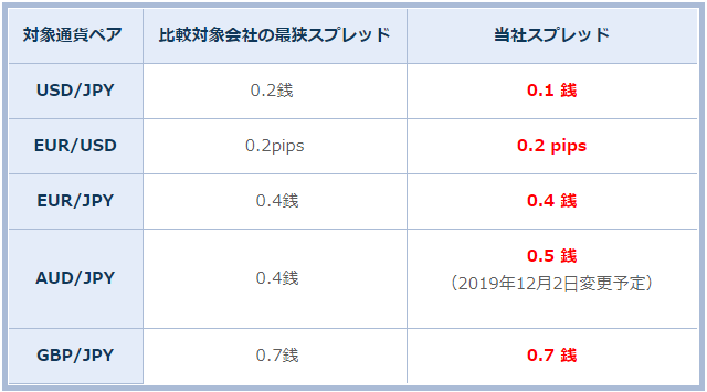 上の画像はゴールデンウェイ・ジャパン社が2019年11月26日に発表した11月度の調査結果です。これを見る限りほとんどの通貨ペアが業界最狭水準となっていますが、豪ドル円のスプレッドが最狭水準ではないようです。しかし、2019年12月2日に0.4銭へと縮小する予定となっています。ドル円だけでなく、他の4通貨ペアについても「日本No.1最狭水準」の有言実行を期待できそうです!