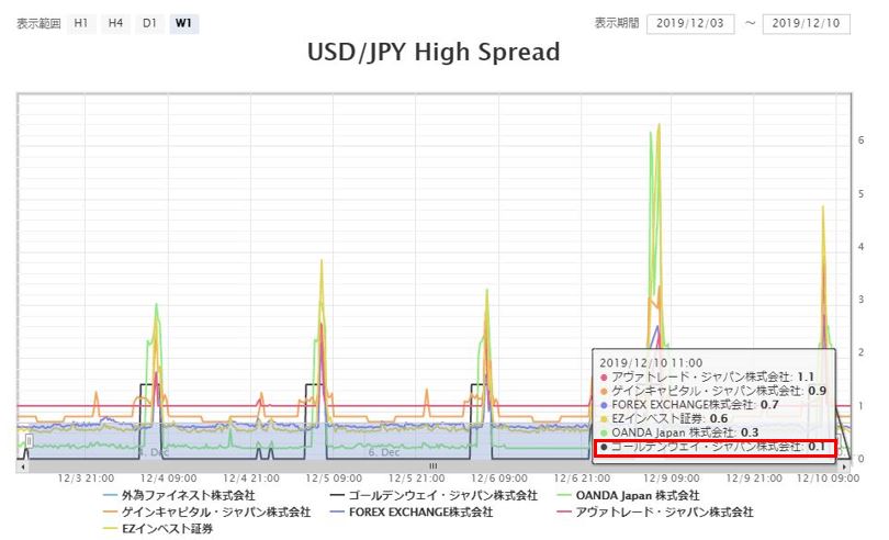 2019年12月10日現在のドル円スプレッドを検証してみたいと思います。比較にはゴゴジャンのリアルタイムスプレッドを計測するページ(https://www.gogojungle.co.jp/markets/spreads/)で、ゴールデンウェイ・ジャパン社と他社のドル円および今回新たに縮小された豪ドル円のスプレッドを確認してみます。