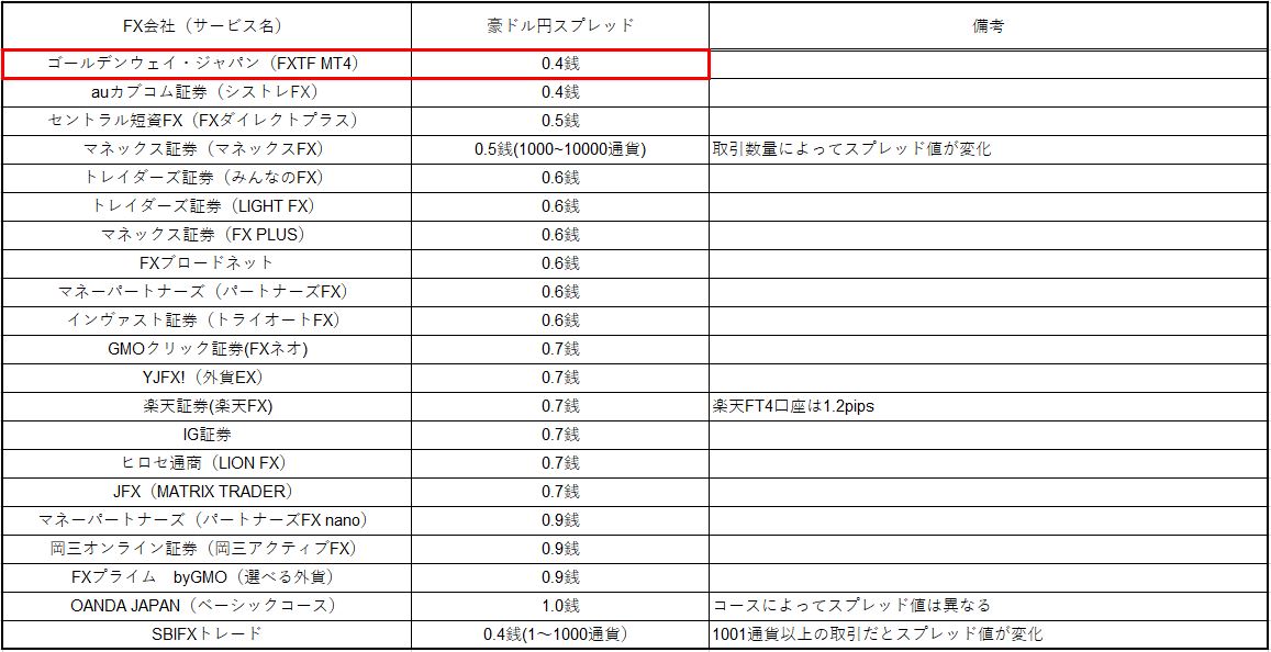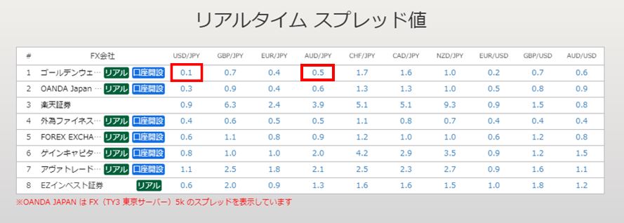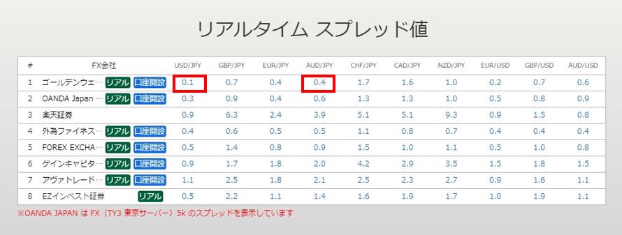 ▲スプレッド一覧での比較でもゴールデンウェイ・ジャパン社のドル円・豪ドル円のスプレッドの狭さが際立っています。