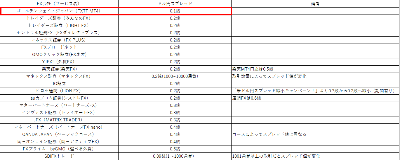 FX会社のドル円スプレッド一覧