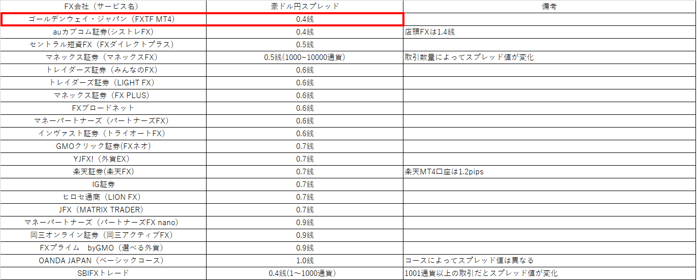 FX会社の豪ドル円スプレッド一覧