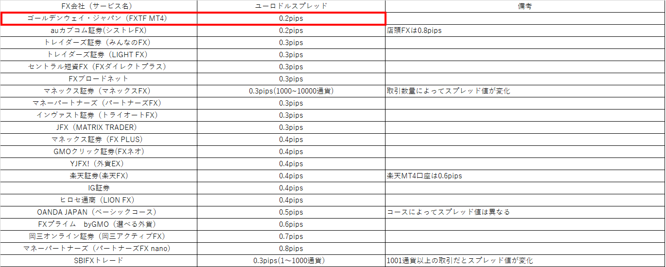 FX会社のユーロドルスプレッド一覧