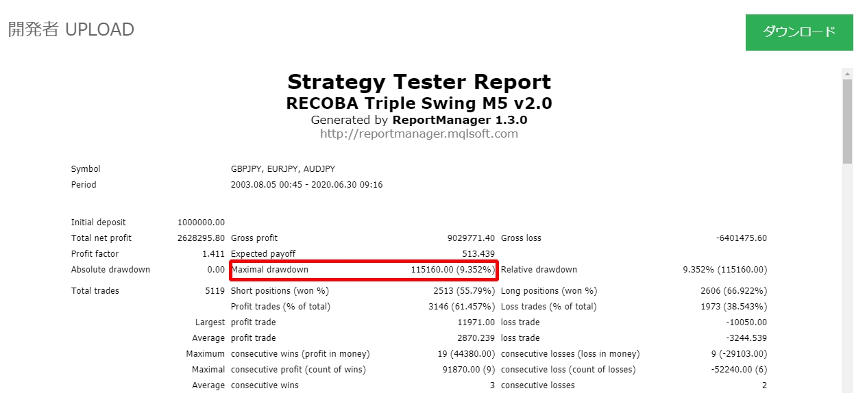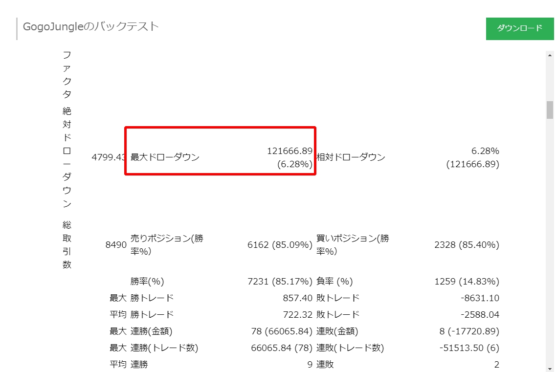 ダウンロードもできますが、簡単に最大ドローダウンがわかりますので必要な項目だけチェックしてみてください。