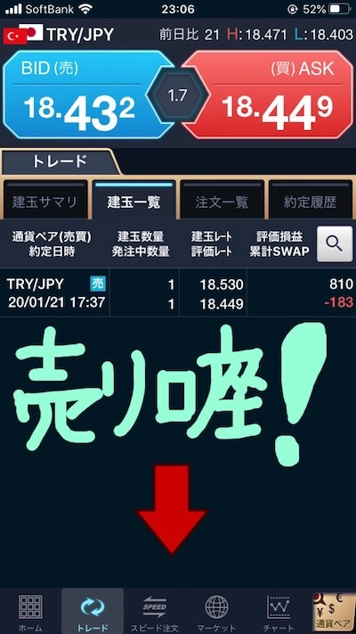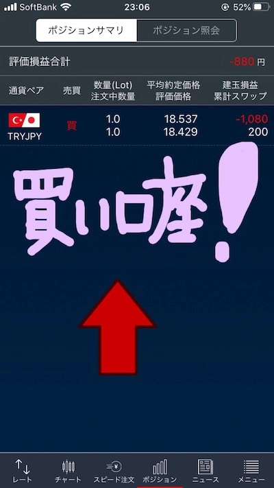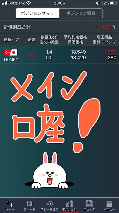 主軸口座で1.4枚トルコリラ円を買い、買い口座と売り口座で1枚ずつ両建て。
