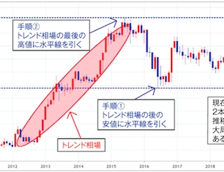 それぞれの傾きや位置関係によって、相場の流れ・転換点を見極めることが可能だと考えています。それでは長期・中期・短期へと話を進めていきます。