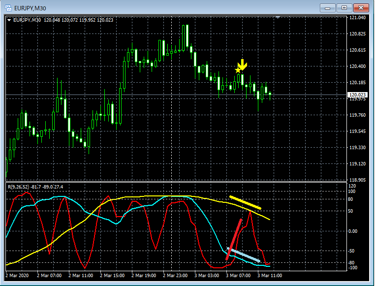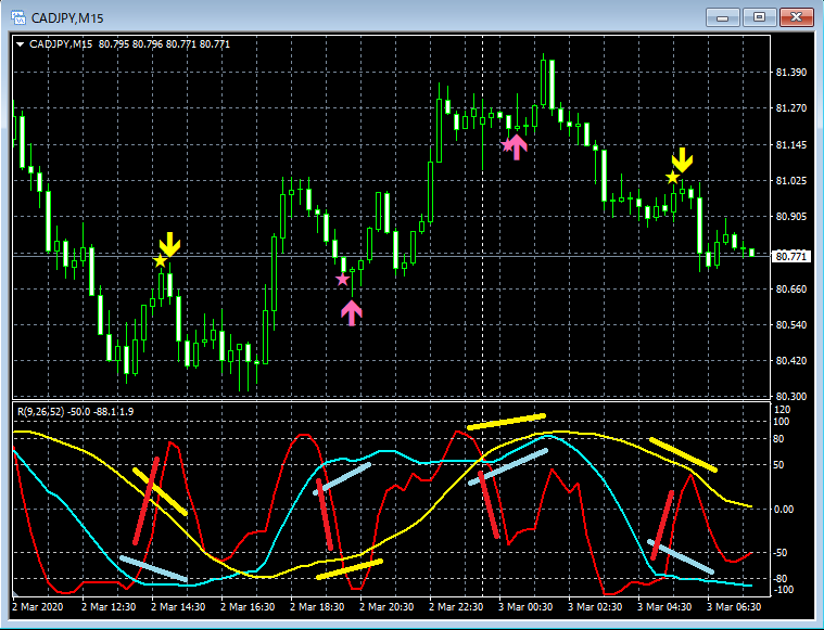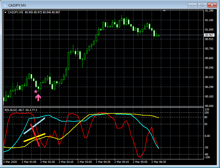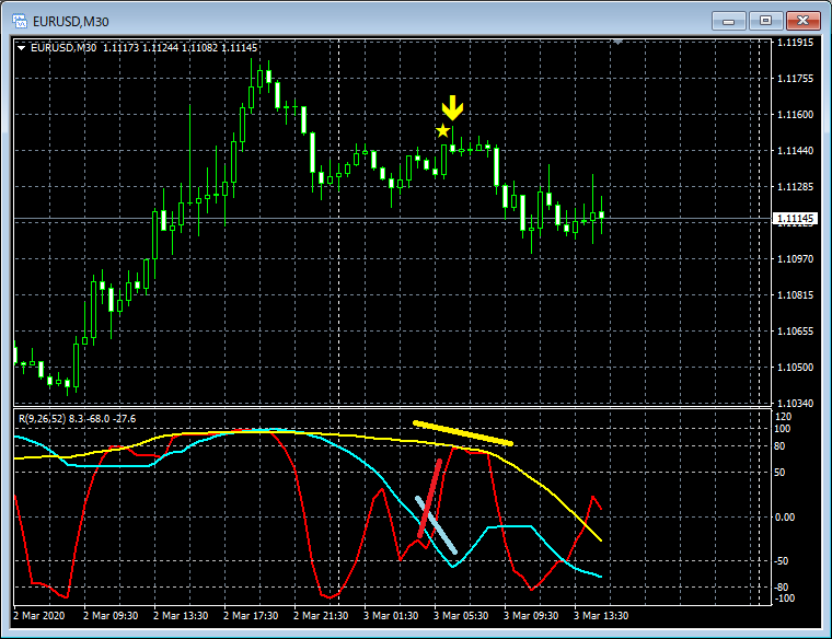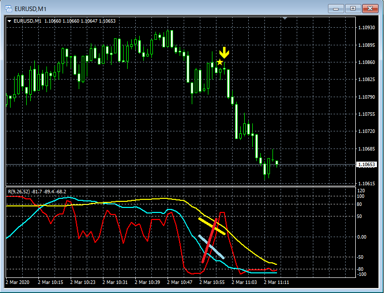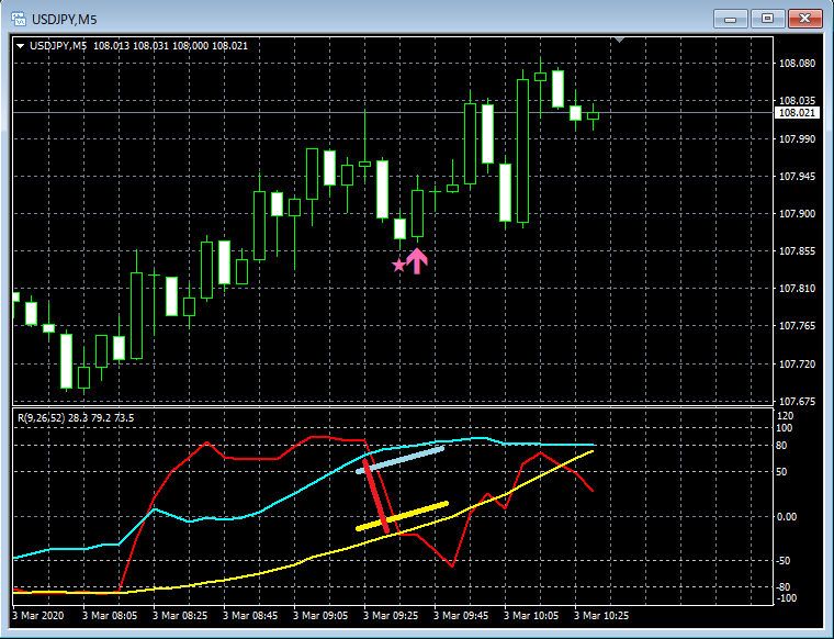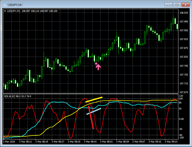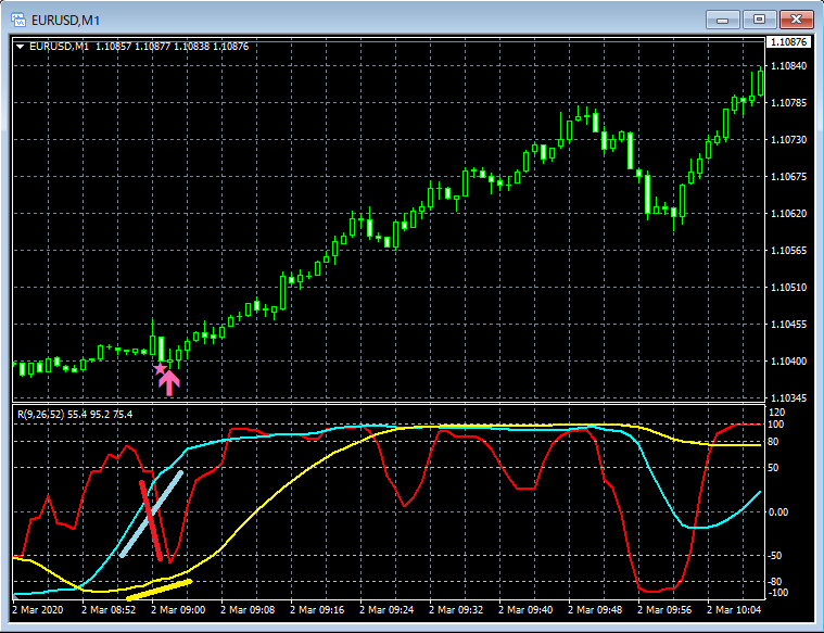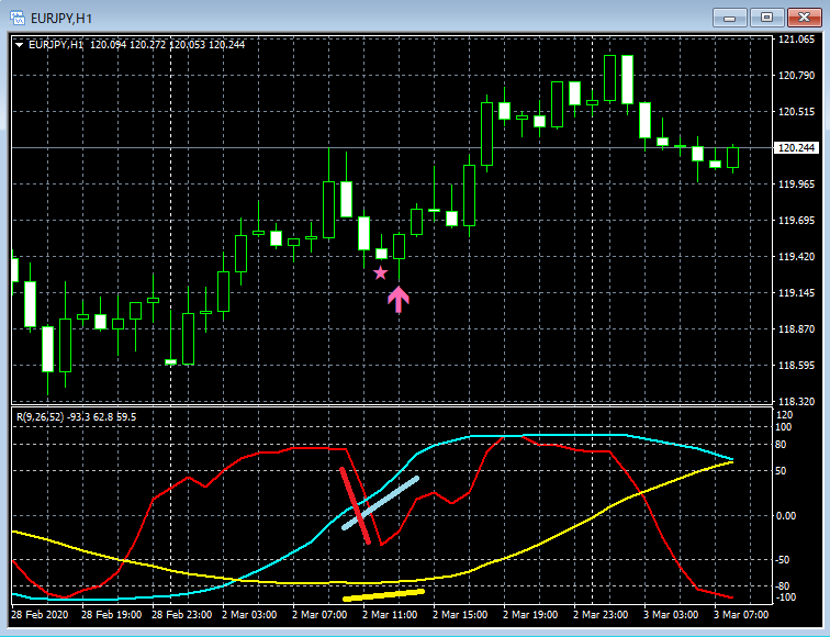 下図は、今週(3月2日~3月6日)見られた「mBDSRのRCI2本フィルターバージョン」のサインの例です。