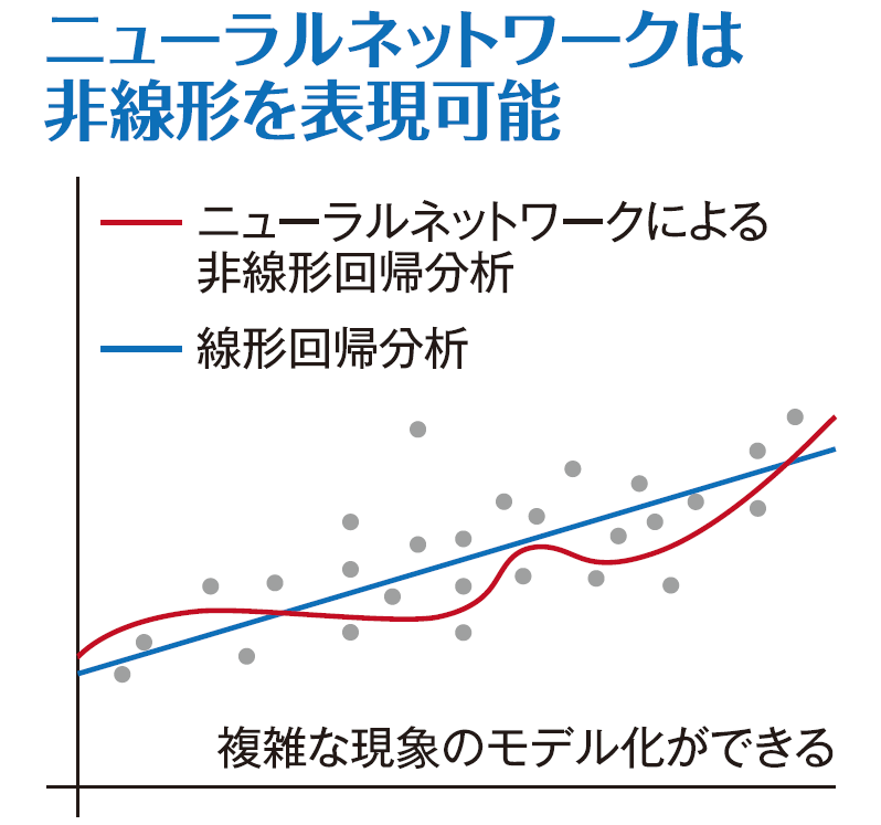 重要なことは、ニューラルネットワークでは、より非線形かつ複雑な関係性を表現できるようになったということです。これによって、より正確に目的変数と説明変数間の関係性を表現できるかもしれません。