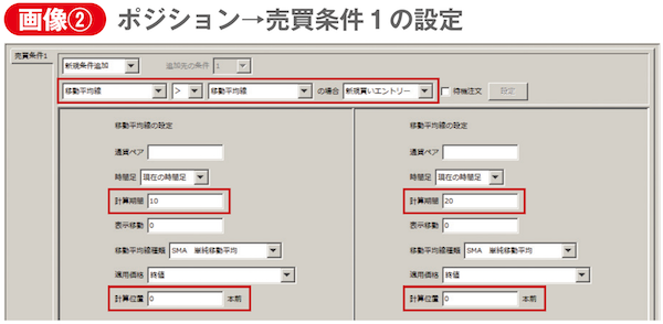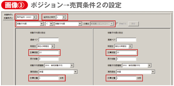 岩淵 売買条件2は、「計算位置」を1本前に設定するのがポイントです。条件1ではデフォルト値0のまま進めましたが、0とは現在のローソク足、1本前とは現在より1本前のローソク足を指します。そして1本前が「10SMA<20SMAの場合、新規買いエントリー」とし、これを条件1と紐付けるために「条件追加(AND)」を選び、追加先の条件を1に(画像③参照)。この工程により紐付けが完了します。