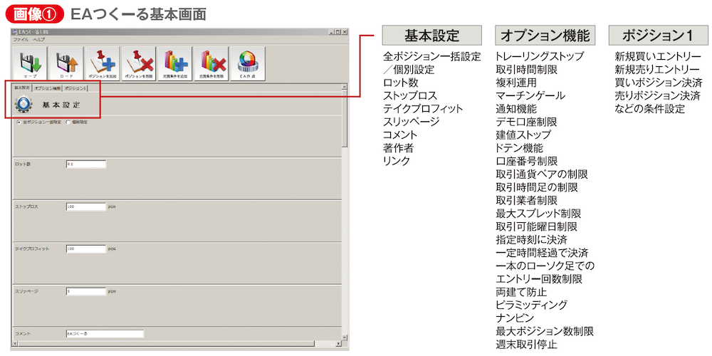 岩淵 EAつくーるの基本画面は「基本設定」「オプション機能」「ポジション」の三つです(画像①参照)。基本設定ではロット数、ストップロス、テイクプロフィットなど、トレードの基本的な条件を設定します。オプション機能では、トレーリングストップをはじめ、ドテン機能や、取引時間を制限する機能など、さまざまな項目を用意しています。そしてポジションはEA作成のメインとなる画面で、ここに条件を入れていくことで、どういったエントリーや決済をするのか決めていきます。