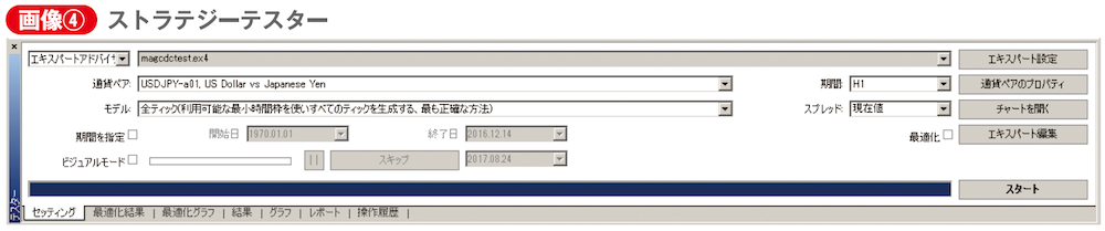そしてテスト結果を基にパラメーターを変更しながら最適なものを探す…というのがオーソドックスな流れです。「エキスパート設定」にて、テスト時の証拠金やパラメーター、ストップロス、テイクプロフィットも変更できます。