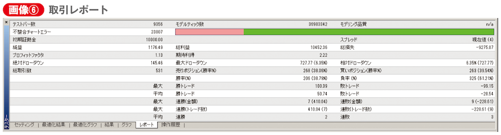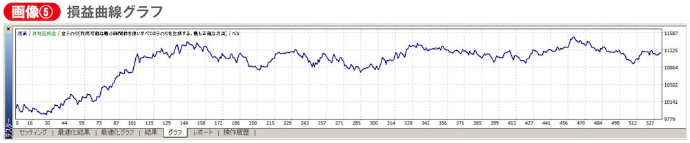条件を設定したら、スタートボタンを押します。ボタン横のゲージが進行状況を示してくれ、これが端まで到達すればテスト完了です。損益曲線グラフ(画像⑤参照)や、取引レポート(画像⑥参照)も出ます。