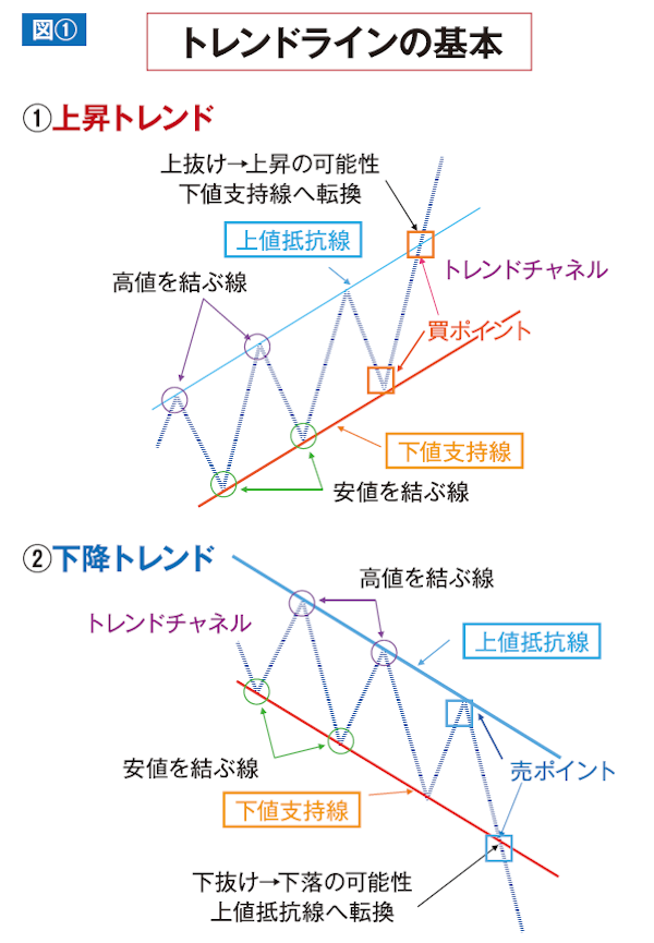 トレンドラインの基本的な描き方は、上値(高いところ=山)と下値(安いところ=谷)に注目して目立つ点(最低2点)を結んで線を引くと、そこが上値抵抗線(レジスタンスライン)や下値支持線(サポートライン)になり、皆が意識するポイントになります(図①参照)。上昇相場が形成されたと認識するためには、高値と安値が切り上がっていること。下降相場であれば、高値と安値が切り下がっていっている状態です。