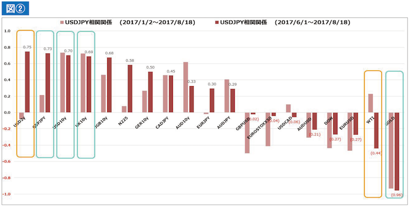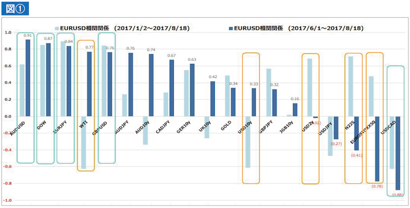 今年2017年1月2日〜8月18日までのデータと、直近約2か月半となる6月1日〜8月18日のデータを、ユーロドル(図①)とドル円(図②)の二つの通貨ペアで相関関係を比較してみました。相関関係は+1.0〜−1.0の間で示され、+1.0は正の最大値で最も強い相関関係があり、逆に−1.0は負の最大値で逆の相関関係を表しています。