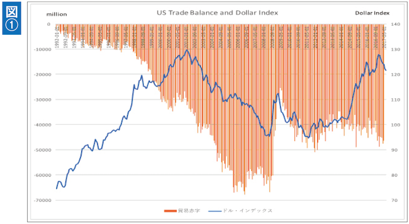 貿易赤字とドル・インデックス(図①)の間には、逆相関の関係があった。しかし、近年このような逆相関の関係が見られない。そのため今後のドル政策として、貿易問題はかつてよりクローズアップされるであろう。貿易赤字の問題は米国の経済成長とも密接に関係しており、米国のビジネスモデルを今後どのようにするかという問題に置き換えられる。