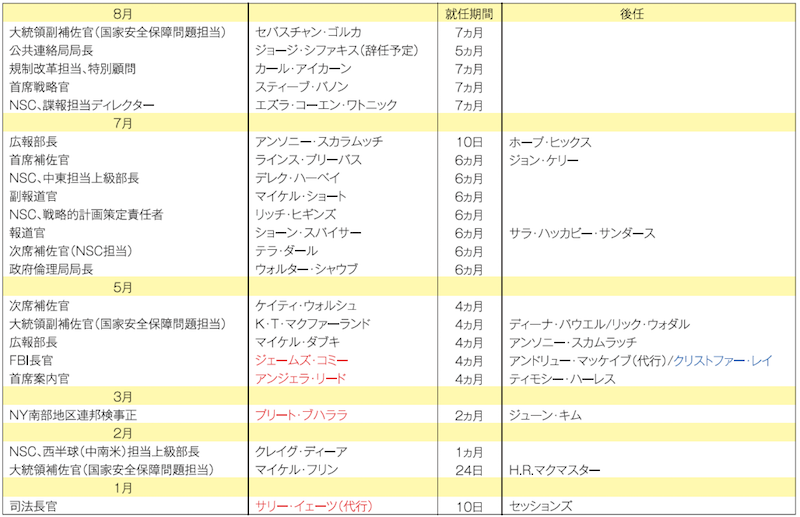 その他、前週末に離任したバノン前首席戦略官と同じくブライトバート出身の元記者でNSC担当の次席補佐官だったテラ・ダール氏は、首席戦略官より1か月も前に辞任していました。まるで、布石だったかのようですね。セバスチャン・ゴルカ大統領副補佐官(国家安全保障問題担当)と合わせ、2人は“国家主義者”のバノン氏傘下にあるブライトバート出身者です。