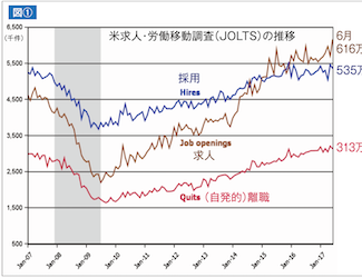やや旧聞に属することとなってしまったが、去る8月8日に米労働省から発表された6月分の「米求人・労働異動調査(JOLTS)」の結果が、珍しく市場を賑わせたことを皆さんは覚えておられるだろうか。それは6月の米企業による「求人」の件数が616万件超と過去最高を更新したからである(図①参照)。