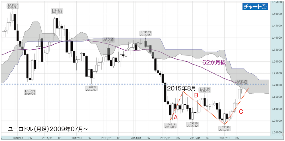テクニカル分析のセオリーによれば、このC波の上昇幅というのは「さしあたりA波の1.236倍や1.382倍になることが多い」とされる。よって、当面のC波の上値の目安というのは計算上、1.1887ドルや1.2070ドルということになるのである。これは、前述した一目均衡表の月足「雲」下限や62か月線と非常に近い水準であるということがわかるだろう。