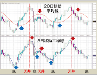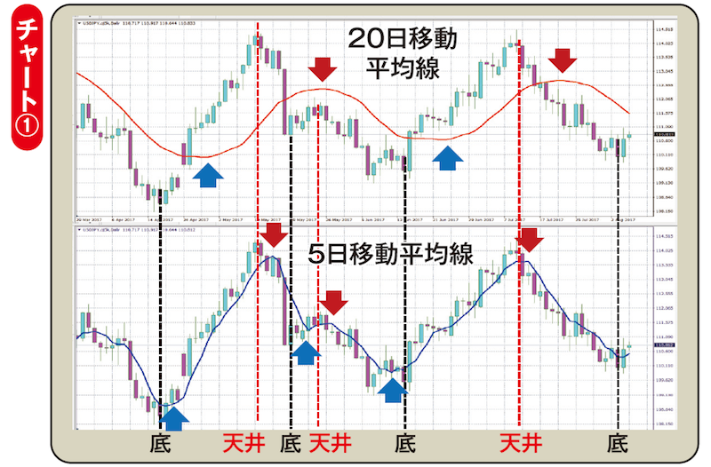 為替の天底の破線と移動平均線の動きを見比べてください。チャート①の上にある20日移動平均線の上下の動きは実際の為替レートの動きに比べ、大きく遅れてしまっていますが、下の5日移動平均線は遅れが少なく、ほぼ正しく相場を予想できていますね。