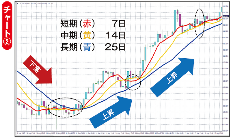 さて、次に短期線(赤)、長期線(青)の他に中期線(黄)を加えたチャート②を見てください。3本の線が、上から順に短期(赤)、中期(黄)、 長期(青)と並んだら上昇、その逆に上から長期(青)、中期(黄)、短期(赤)と並んだら下落と予想します。移動平均線がそれ以外の順序になった箇所を黒の破線で囲みましたが、そのようなところは為替がもみ合っている時期です。冒頭で書いたように、もみ合いの相場は移動平均線の予想が難しいので、売買は控えます。