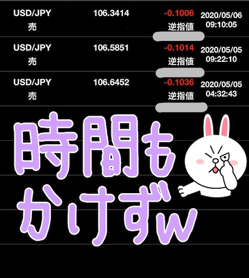 ロスカットになる場合、1時間以内に狩られることがほとんどです。ごくたまに、1日近く粘って結局は損切りされることもあり、こうなるとちょっとくやしいw