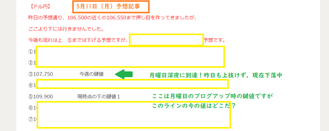 その予想記事(11日月曜日)です。結局、月曜日、火曜日とここを上抜けられず下げています。