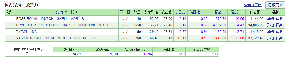 現在の含み損は下記の通りで、確定利益や配当との累計損益では、$10,600のマイナスとなっています。