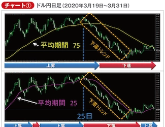 山中 そうです。実際にMTF移動平均線を週足として表示した2019年末からのドル円日足チャートを見ていきましょう(チャート①)。ここで表示しているカスタムインジケーターは私が作成したものです。期間20週の単純移動平均線(SMA)を赤い線で表示しています。
