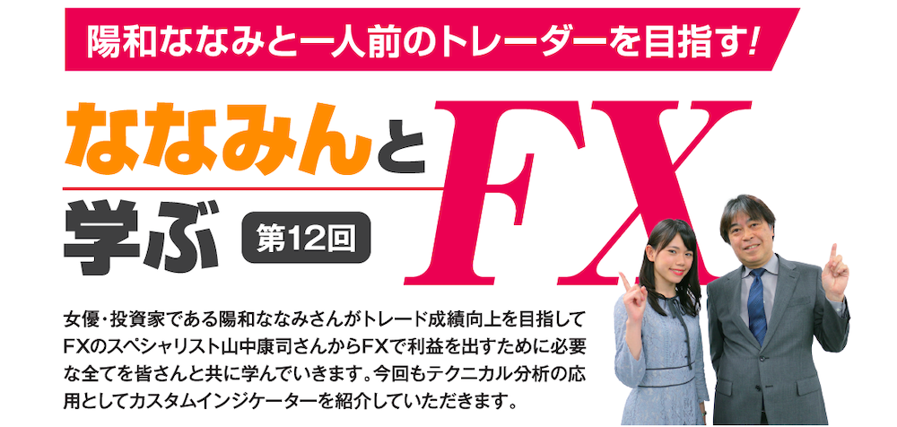 女優・投資家である陽和ななみさんがトレード成績向上を目指してFXのスペシャリスト山中康司さんからFXで利益を出すために必要な全てを皆さんと共に学んでいきます。今回もテクニカル分析の応用としてカスタムインジケーターを紹介していただきます。