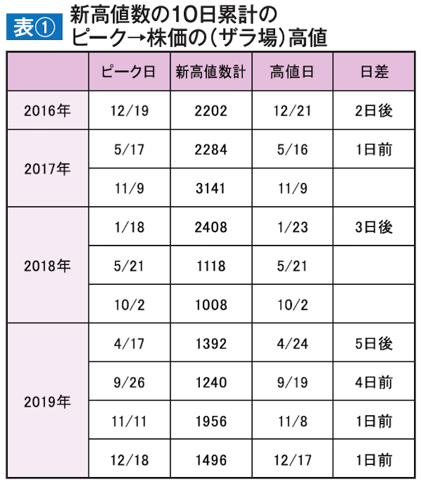 株価が上昇し、高値を形成する過程では当然のことながら、日々の新高値数が拡大します。特に高値直前の2週間分、10日分の累計と高値の日がほぼ前後するという傾向があります(表①)。