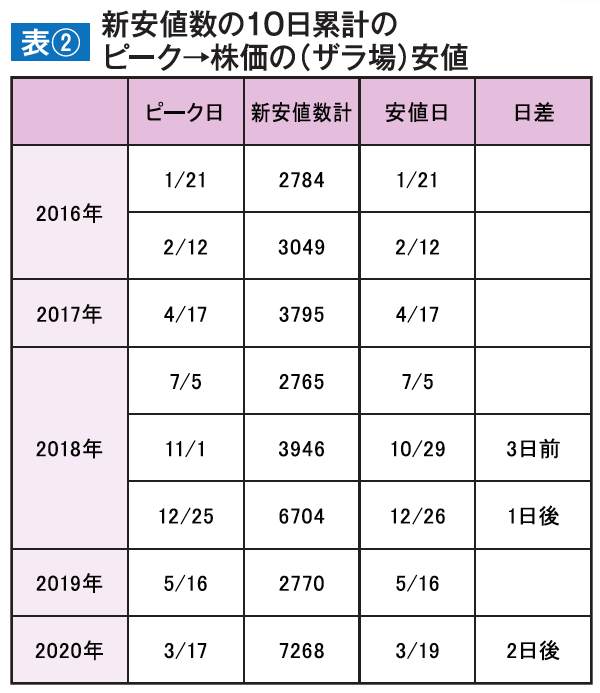 逆もまた真なりで、株価が大きく下げ、安値をつけるときには新安値数が急拡大、高値のときよりも明確に新安値数の10日累計のピークと安値がほぼ一致します(表②)。売買のタイミングとしては有効ということになります。