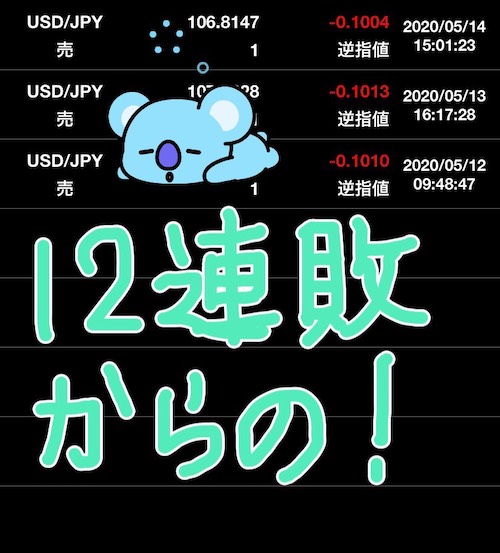 この勝利まで12連敗してました。ドルレゴは勝率が低いロジックなので、このぐらいの連敗はあるあると思わないと運用できません。でも1回の負けが10pipsだから、ちょっとくらい連敗しても痛くありませんけど。